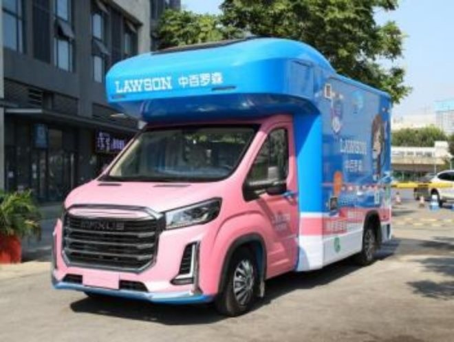移動販賣車以“櫻花粉”和“羅森藍(lán)”為主色調(diào),采用羅森自有IP億億醬在內(nèi)的多個卡通形象裝飾車身