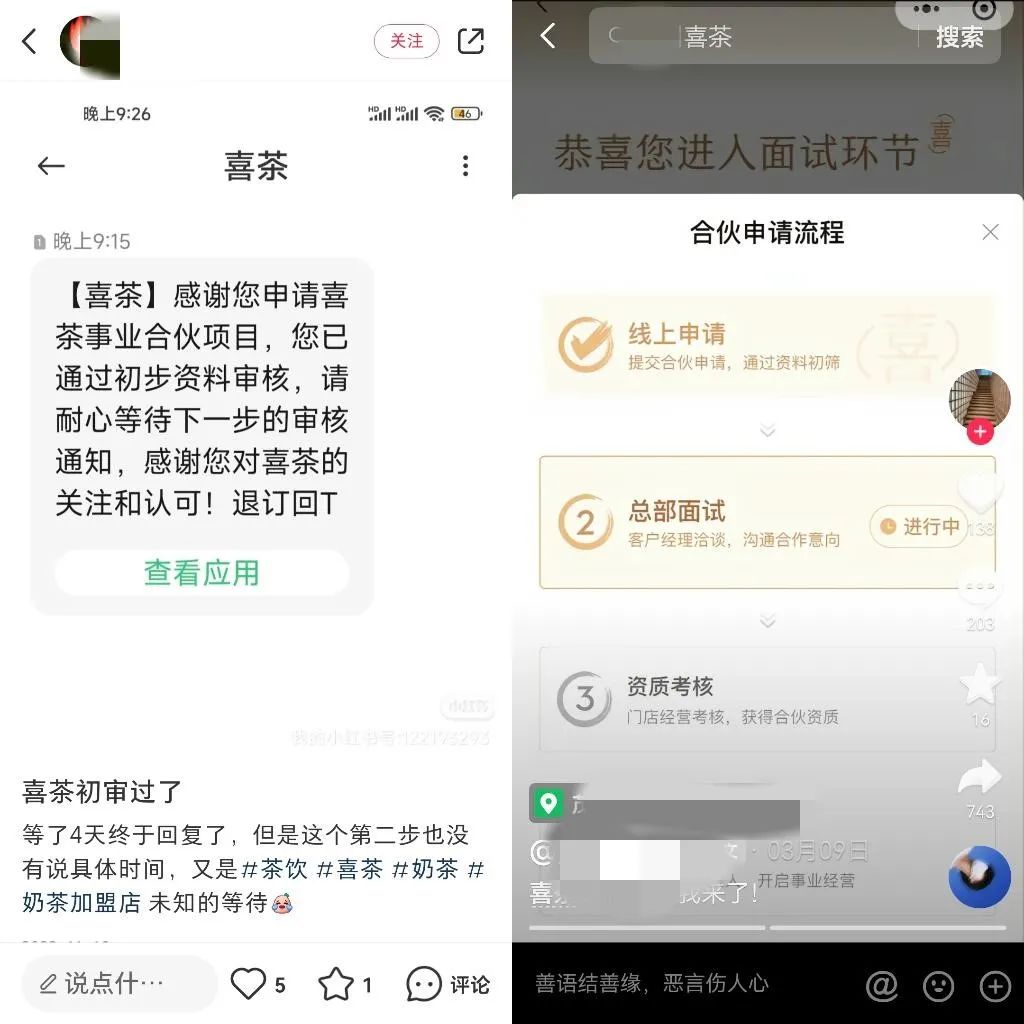 社交平臺(tái)上,關(guān)于喜茶的話題,不再僅僅是出了什么新品,或者推薦哪一款茶飲。打開小紅書、抖音和微博,喜茶相關(guān)的話題頁面里,多了不少“怎么通過喜茶面試”和“喜茶加盟到底怎么做”的內(nèi)容。
