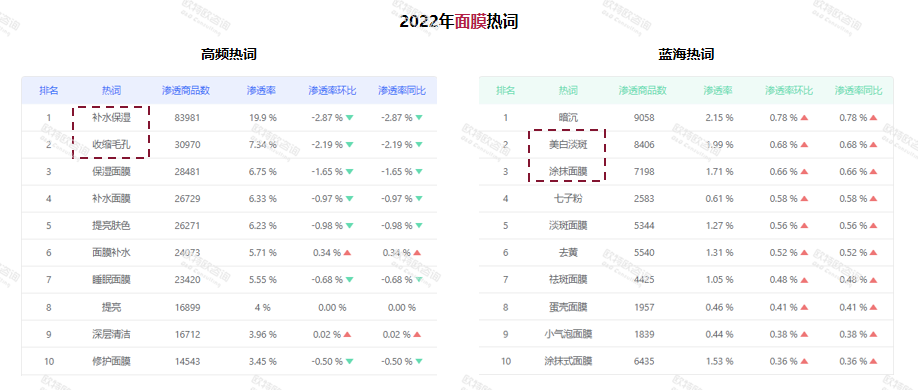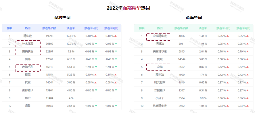從消費者端來看,補水保濕、提亮膚色仍為面部精華產品的重點需求,滲透商品數和滲透率也位于前排。與此同時,次拋精華液、次拋等藍海詞匯滲透率也在逐漸上升!熬A油這種新產品形態(tài)增長較好,可能會是未來的一個增長契機!绷_興認為。