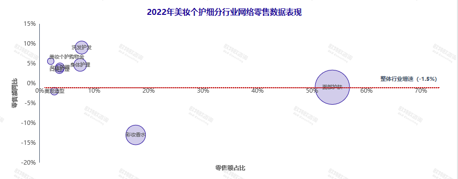 羅興總結年度監(jiān)測數據指出,2022年美妝個護線上同比下滑1.5%,銷售額在全網份額占比9.5%,排名第四,次于服裝服飾、家用電器品類。
