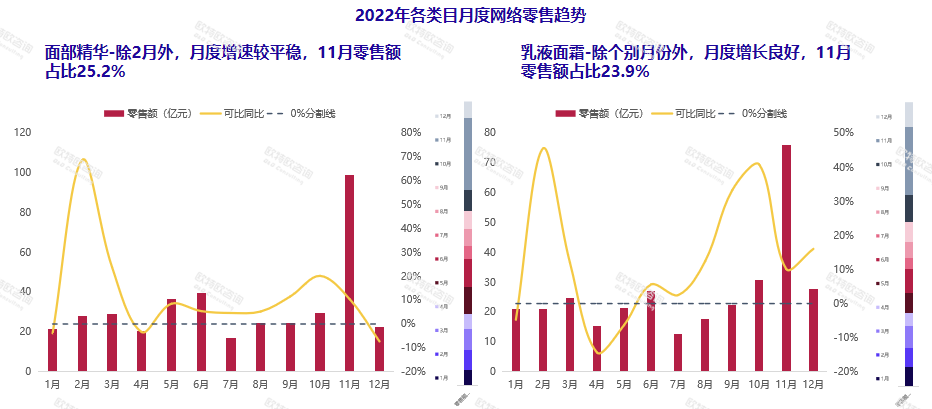 白皮書顯示,在面部護理產品中,增速最快的兩大細分類目為面部精華和乳液面霜。二者月度增速都較為平穩(wěn),11月銷售額最為亮眼,零售額占比均在24%左右。