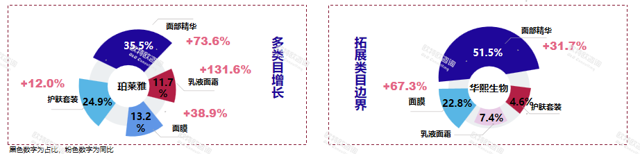 除此之外,作為本土企業(yè)中的兩大佼佼者,珀萊雅和華熙生物也在不斷拓展類目上的邊界。白皮書顯示,珀萊雅的乳液面霜類產品占比雖然只有11.7%,但增勢猛烈,同比增長131.6%。華熙生物的面膜品類也表現良好,同比增長67.3%。