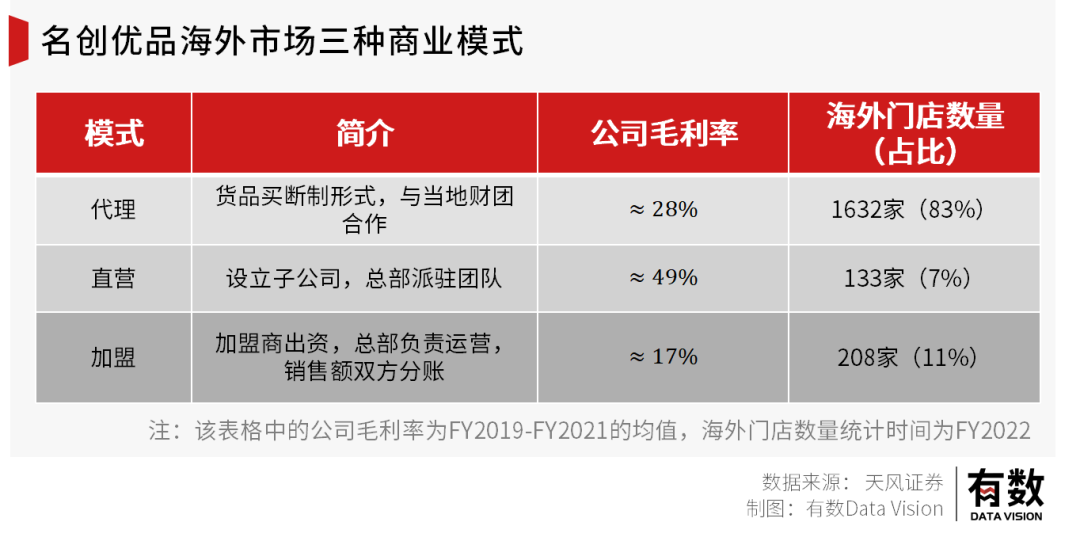 在海外市場(chǎng),名創(chuàng)優(yōu)品有三種商業(yè)模式:直營(yíng),加盟(即國(guó)內(nèi)的合伙人模式)和代理。每到一個(gè)新市場(chǎng),名創(chuàng)優(yōu)品會(huì)先開直營(yíng)店打樣,再借此吸引海外加盟商。