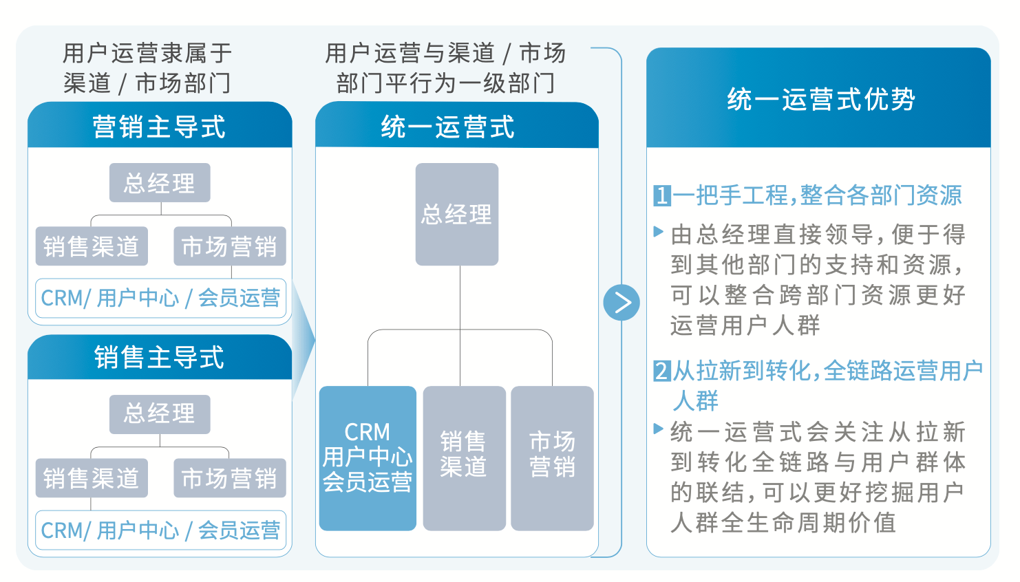 《白皮書》結(jié)合伽藍(lán)集團(tuán)、名創(chuàng)優(yōu)品、安奈兒、香港莎莎等企業(yè)案例,展示了恰當(dāng)?shù)挠脩暨\(yùn)營(yíng)團(tuán)隊(duì)、適配的組織架構(gòu)以及強(qiáng)有力的數(shù)字化基建對(duì)深度挖掘用戶價(jià)值的重要意義。立志于開展精細(xì)化用戶運(yùn)營(yíng)的商家,需要朝著統(tǒng)一運(yùn)營(yíng)式的組織構(gòu)架不斷演進(jìn),配合生態(tài)產(chǎn)品,加速數(shù)字化變革。