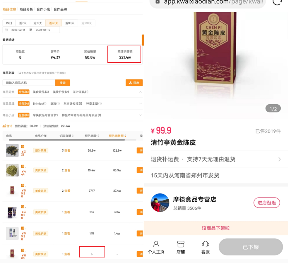 記者還留意到,在200多萬元的GMV中,3.33元的茶葉貢獻(xiàn)了超過100萬元的收入,而價(jià)格最高的一款商品“清竹亭黃金陳皮”售價(jià)99.9元,銷量卻僅5件。