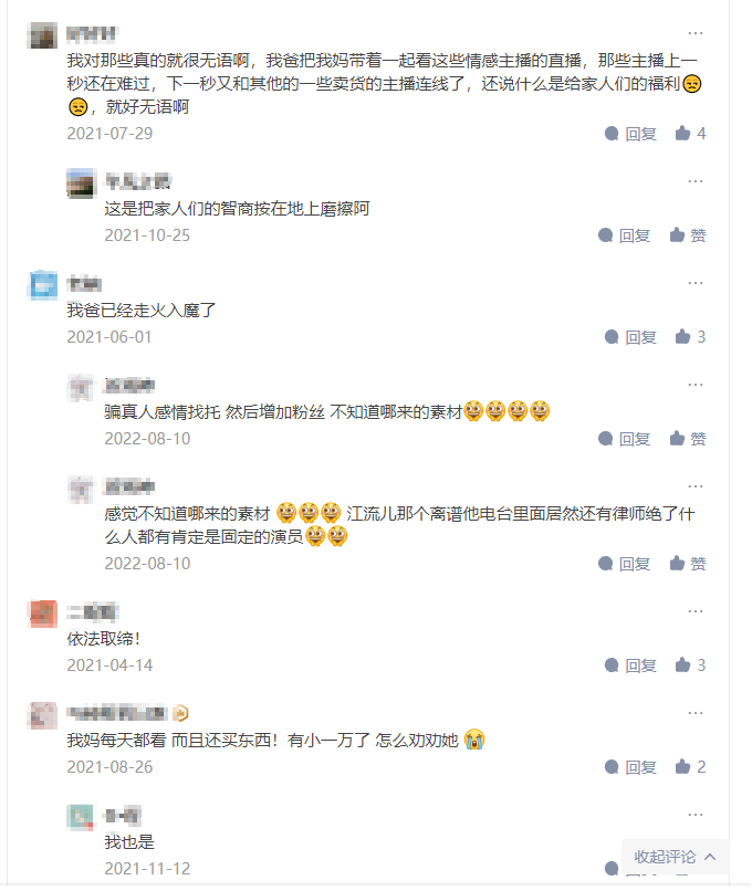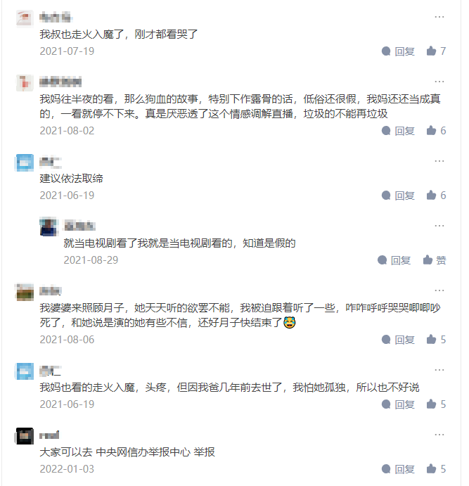 3月15日當(dāng)天晚上,晚會(huì)曝光的“高冷z”“小張說事”“馬洪亮”等主播,在相應(yīng)平臺(tái)的賬號(hào)均已被封。然而,記者留意到,這類情感調(diào)節(jié)主播并不少見。在知乎上,#如何看待很火的情感調(diào)解主播#話題有超過12萬人次瀏覽,“為了流量”“專演給老人看”“無下限賣貨”等表述被多次提及,評(píng)論區(qū)成了大型吐槽現(xiàn)場(chǎng)——“親兒子還不如假兒子說話有用”。