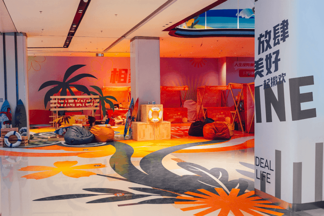 為了打破室內(nèi)大盒子式購物中心的封閉感,強(qiáng)化購物輕松感和京西微度假的項目屬性,在5層屋頂增設(shè)了星空露臺,開放式半戶外的沉浸式體驗,讓消費者可在此駐留休憩、抬頭盡覽京西美景。同時,將微笑市集搬到場內(nèi),融入N+咖啡特色品牌,讓京西年輕潮人能夠在城市中體會到度假感受。