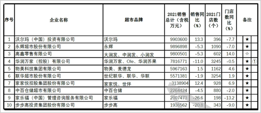 2021年中國超市TOP10 來源:中國連鎖經(jīng)營協(xié)會