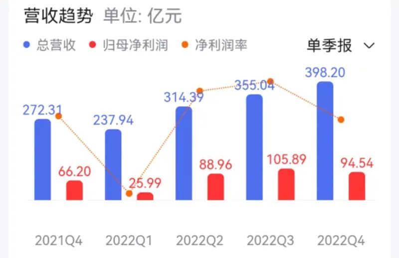 回到財報自身來看,2022年第四季度拼多多凈利潤為94.54億元,較2022年第三季度的105.89億元,環(huán)比下降了12%;2022年第四季度總營收為398億元,環(huán)比增長了12%,和第三季度的增速幾乎持平,遠(yuǎn)低于第二季度環(huán)比增長的32%。