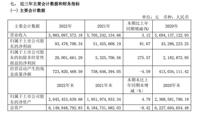 2022年,新華百貨實現(xiàn)營收58.83億元,同比增長3.12%;實現(xiàn)歸屬于上市公司股東凈利潤9,347.87萬元,同比增長81.67%;歸屬上市公司股東的扣非凈利潤2000.17萬元,同比大增275.57%;經(jīng)營活動產(chǎn)生的現(xiàn)金流凈額7.24億元,同比下降4.59%。