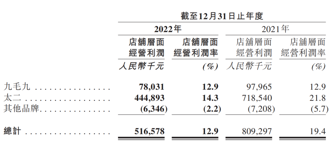 在店鋪層面的經(jīng)營利潤率上,九毛九餐廳為12.9%,和前年沒什么變化。太二卻從21.8%降到了14.3%,降幅不小。