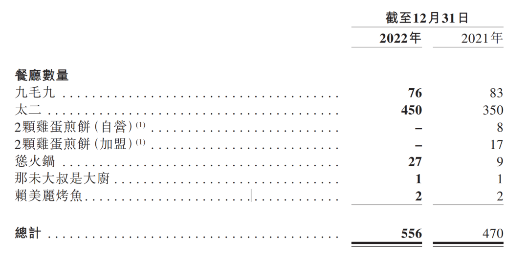 2022年其新開120家餐廳,其中包括102家太二餐廳及18家慫火鍋餐廳,并關(guān)閉10家自營餐廳。