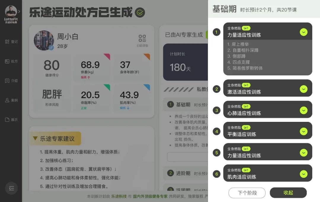 教練根據(jù)“處方”上的建議,并結(jié)合用戶的運(yùn)動(dòng)能力,實(shí)時(shí)為用戶調(diào)整訓(xùn)練計(jì)劃,每個(gè)階段性訓(xùn)練結(jié)束后,系統(tǒng)將自動(dòng)生成新的訓(xùn)練報(bào)告并動(dòng)態(tài)調(diào)整下一階段訓(xùn)練計(jì)劃,確保訓(xùn)練方案能最適合用戶的現(xiàn)狀。此外,系統(tǒng)在每節(jié)私教課后能智能精準(zhǔn)推送包括醫(yī)療服務(wù)、飲食代餐、體檢提示及健身產(chǎn)品等匹配的增值服務(wù),目前已實(shí)現(xiàn)健身交互場(chǎng)景的服務(wù)閉環(huán)。