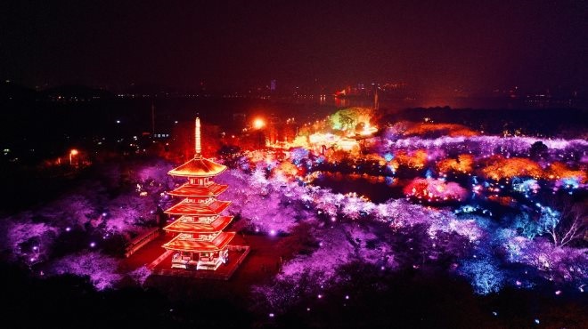 武漢以“相約春天賞櫻花”為主線,營造全城賞花、全時賞花的氛圍。武漢東湖櫻園內(nèi)栽種有上萬株櫻花,從3月初至4月上旬“接力”綻放。今年,“夜間賞櫻”全新升級,櫻花園內(nèi)共設(shè)立有9000多套夜燈、500個燈籠。夜幕降臨,唐風(fēng)建筑群“曲院櫻艷”和櫻花海相互映襯,帶給游客重回盛唐的夢幻體驗。