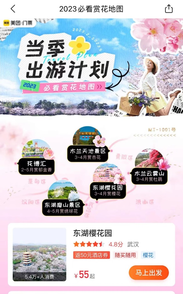 除更新夜場產(chǎn)品外,包括武漢東湖櫻花園、無錫太湖黿頭渚風(fēng)景區(qū)、成都漫花莊園等全國數(shù)百家景區(qū)與美團合作,推出限時特惠門票,為消費者提供“又好又省”的旅游服務(wù)產(chǎn)品!氨乜促p花地圖”匯總各地賞花景點及花期,連接寶藏供給,幫助更多消費者更便捷地找到“賞花好去處”。