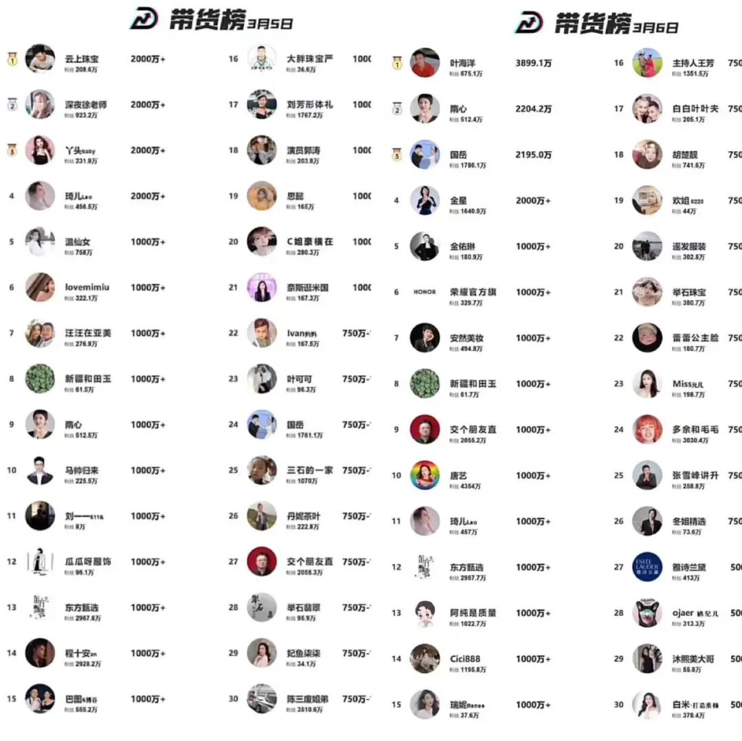 字母榜曾報道,1月20日至2月20日,東方甄選月銷售額從此前的5~7億元,跌至2.5~5億元。抖動數(shù)據(jù)顯示,3月5~6日,東方甄選1000萬+的帶貨數(shù)據(jù)已經(jīng)跌出帶貨榜單前十。