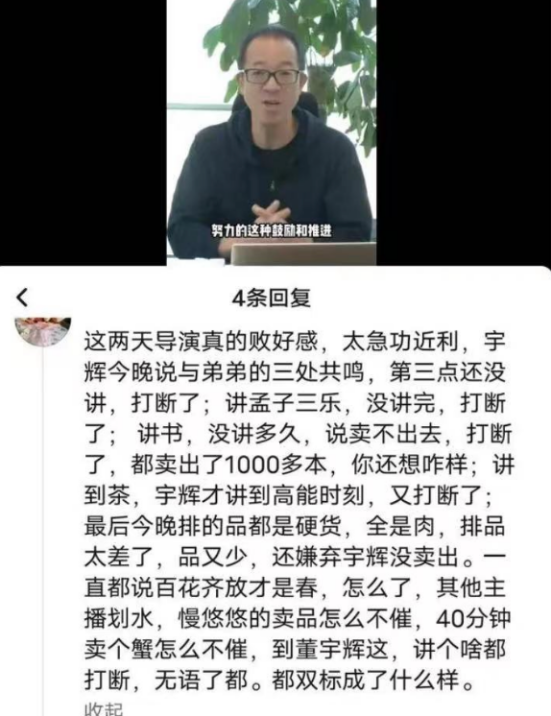 這種博弈引起了粉絲的強烈不滿,比如有網(wǎng)友曾對導(dǎo)播多次打斷董宇輝表示不滿,“導(dǎo)播真的敗好感,宇輝說與弟弟的三處共鳴時,第三點還沒講,打斷了;講孟子三樂,沒講完,打斷了;講書,沒有講多久,說賣不出去,打斷了;講到茶,才講到高能時刻,又打斷了。”
