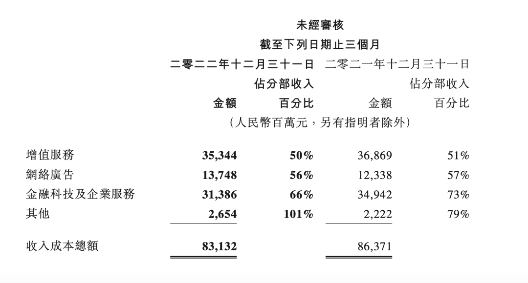 從業(yè)務板塊來看,在三大收入支柱(增值服務、網(wǎng)絡廣告,金融科技及企業(yè)服務)中,成本收入比全線下降,下降幅度從1%到7%不等。下降幅度最大的是金融科技及企業(yè)服務,從2021年Q4的73%下降到66%。
