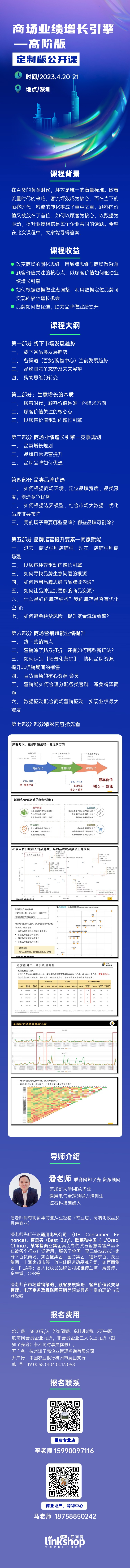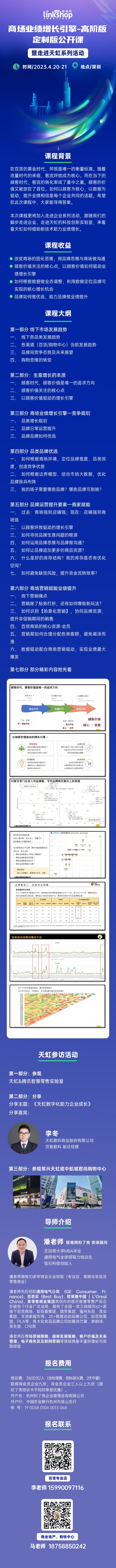 對此,4月20-21日,聯(lián)商網(wǎng)將在深圳舉辦一場商場業(yè)績增長引擎--高階版定制公開課,我們將邀請擁有10余年商業(yè)從業(yè)經(jīng)驗(yàn)的潘老師為大家分享,此外,我們還會組織走進(jìn)天虹,參觀天虹&騰訊智慧零售實(shí)驗(yàn)室以及天虹門店,同時天虹數(shù)科商業(yè)股份有限公司靈智數(shù)科副總經(jīng)理李冬也將分享。希望在此次課程中,大家能尋得答案。