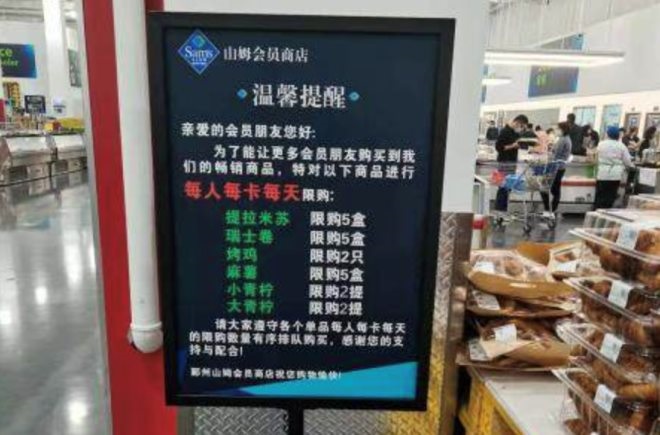 據(jù)媒體報(bào)道,寧波一山姆會(huì)員店就曾在商品貨架邊陳列了提示立牌:針對(duì)部分暢銷商品,每人每卡每天僅限購提拉米蘇、瑞士卷、麻薯各五盒;烤雞兩只;大、小青檸各兩提。