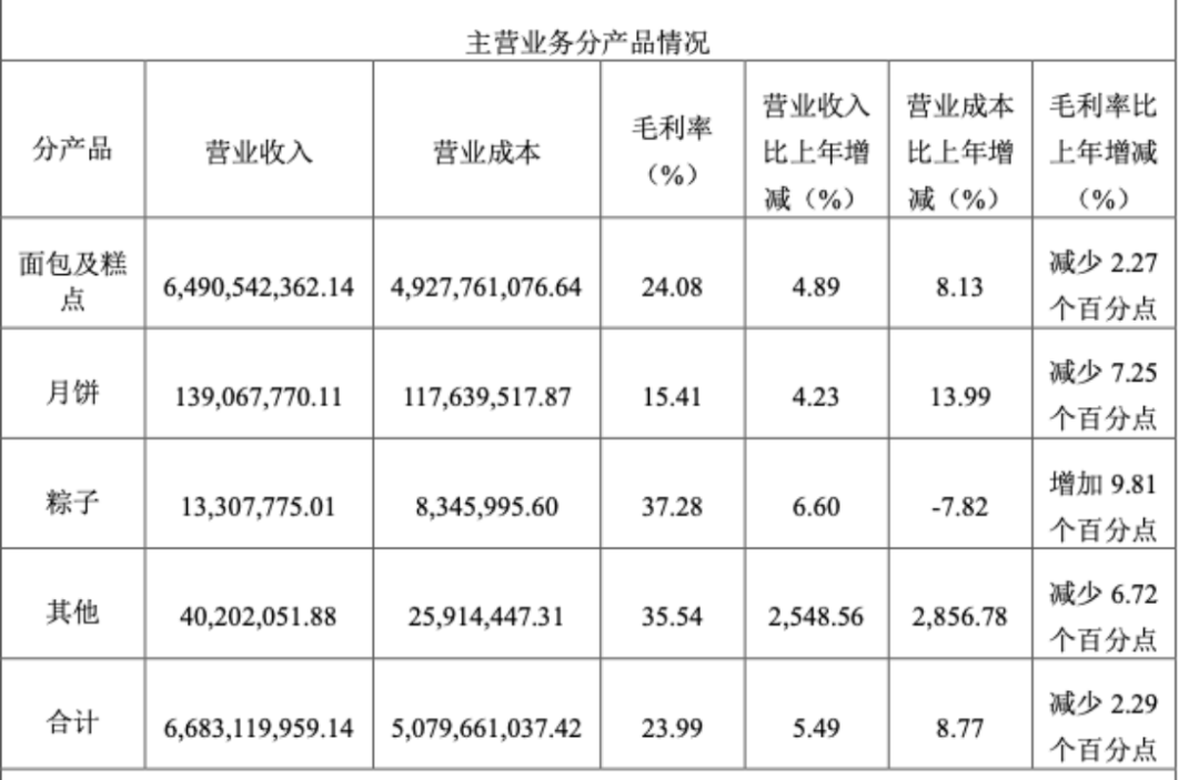 其他的產(chǎn)品,像是粽子、月餅,在2022年銷售收入只有1.33億、1.39億,和面包的64.9億,是天地之差。