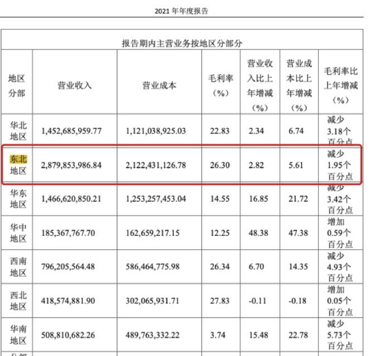 在2021年,桃李在東北的收入為28.79億,同比增加2.82%;