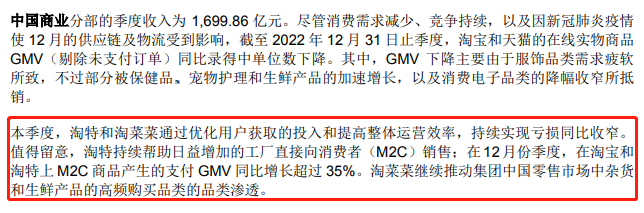 在阿里最新發(fā)布的2023財(cái)年第三季財(cái)報(bào)中,關(guān)于淘特的描述為“淘特和淘菜菜通過優(yōu)化用戶獲取的投入和提高整體運(yùn)營(yíng)效率,持續(xù)實(shí)現(xiàn)虧損同比收窄……在淘寶和淘特上 M2C 商品產(chǎn)生的支付 GMV 同比增長(zhǎng)超過 35%!