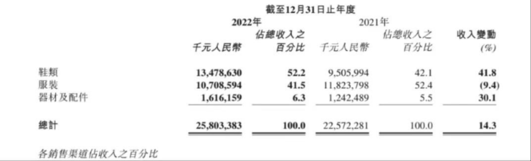 回歸李寧財報數(shù)據(jù),另一個值得注意的變化是:李寧鞋類收入同比增長41.8%至136.79億元,占總營收的52.2%,服裝收入同比下降了9.4%至107.09億元,鞋類收入重新超過服裝收入。
