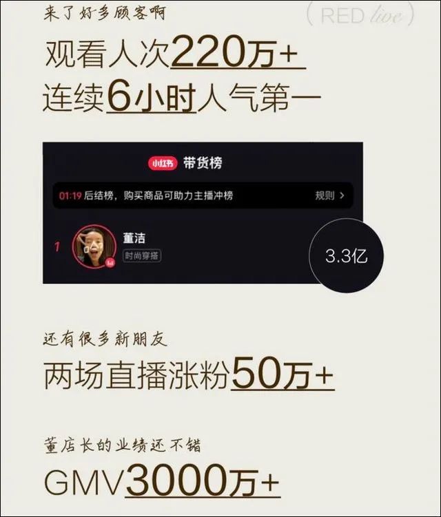 進(jìn)入2023年,明星董潔在小紅書開直播,單場(chǎng)直播GMV超過3000萬,為小紅書開了個(gè)好頭。