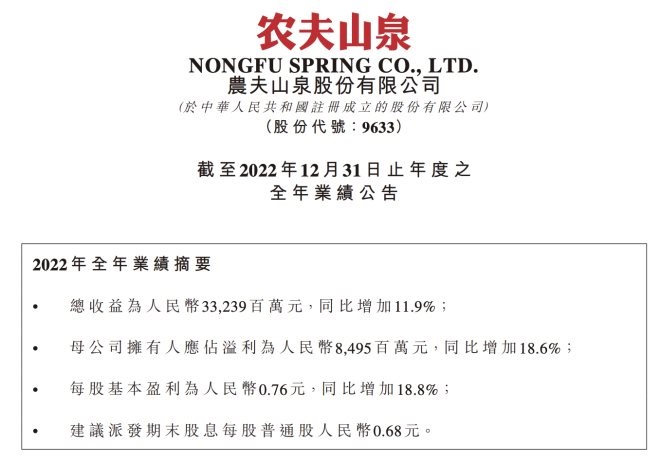 農(nóng)夫山泉2022年營收332.39億,凈利同比增長18.61%