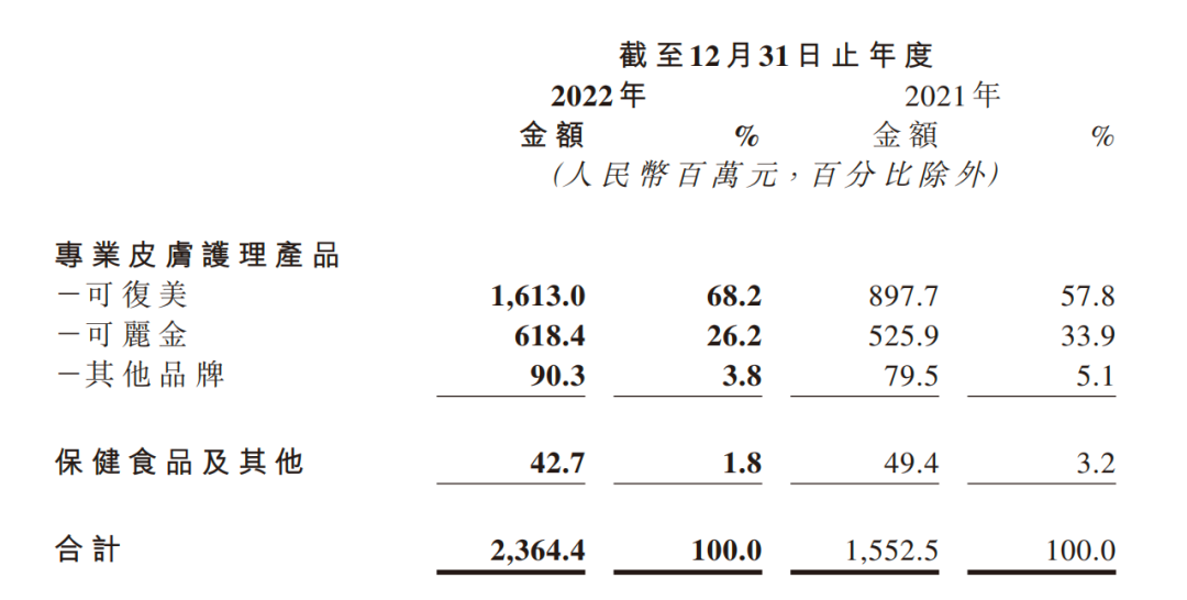其中在功效性護(hù)膚品和醫(yī)用敷料兩大品類上,主打重組膠原蛋白敷料及次拋精華的皮膚科級(jí)別專業(yè)皮膚護(hù)理品牌可復(fù)美和主打重組膠原蛋白噴霧及面膜的中高端、多功能的功效性皮膚護(hù)理品牌可麗金貢獻(xiàn)了大部分營(yíng)收。