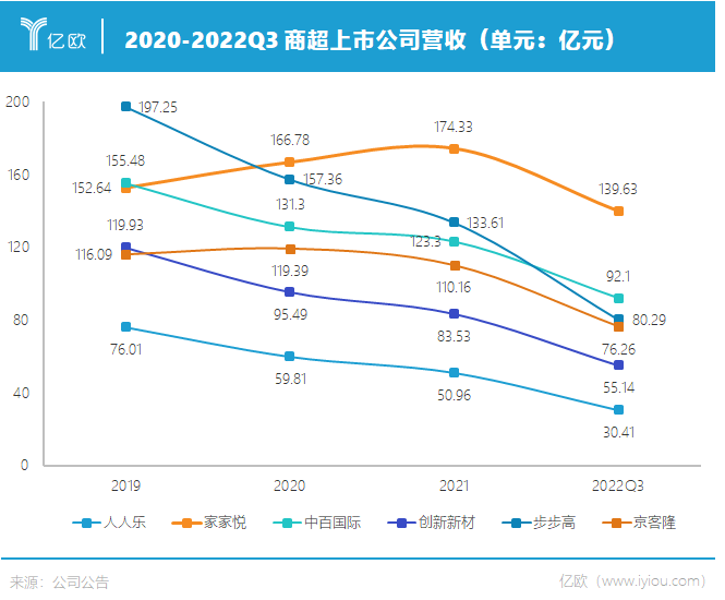 同花順iFinD數(shù)據(jù)顯示,2019-2021年及2022年1-9月,步步高、中百國際、人人樂、創(chuàng)新新材(原華聯(lián)綜超)等商超的營收均呈現(xiàn)連年下滑趨勢。