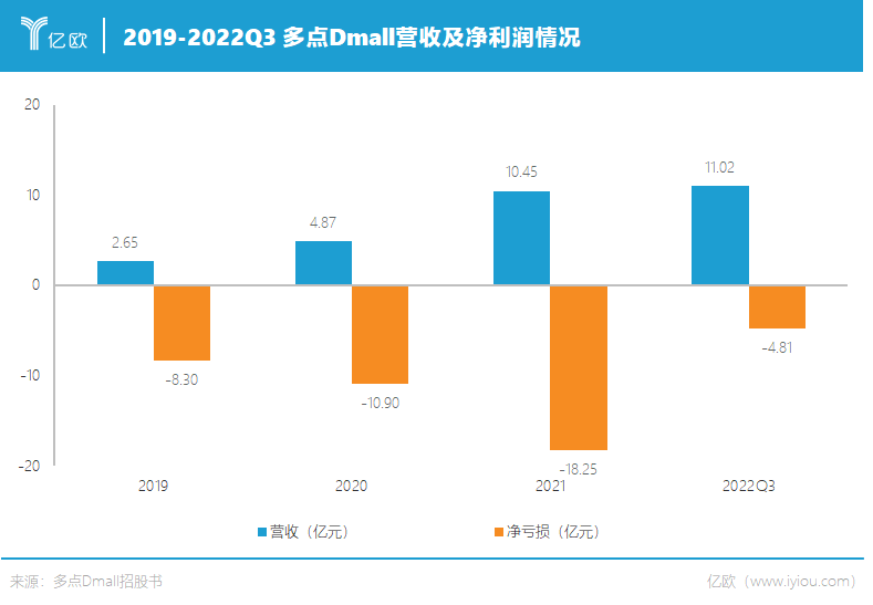 經(jīng)過多年發(fā)展,多點Dmall仍然深陷虧損泥潭。招股書顯示,2019年至2022年前三季度,多點Dmall分別實現(xiàn)營收2.65億元、4.87億元、10.45億元、11.02億元,2019-2022年前三季度,分別虧損8.3億元、10.9億元、18.25億元和4.81億元,累計超42億元。