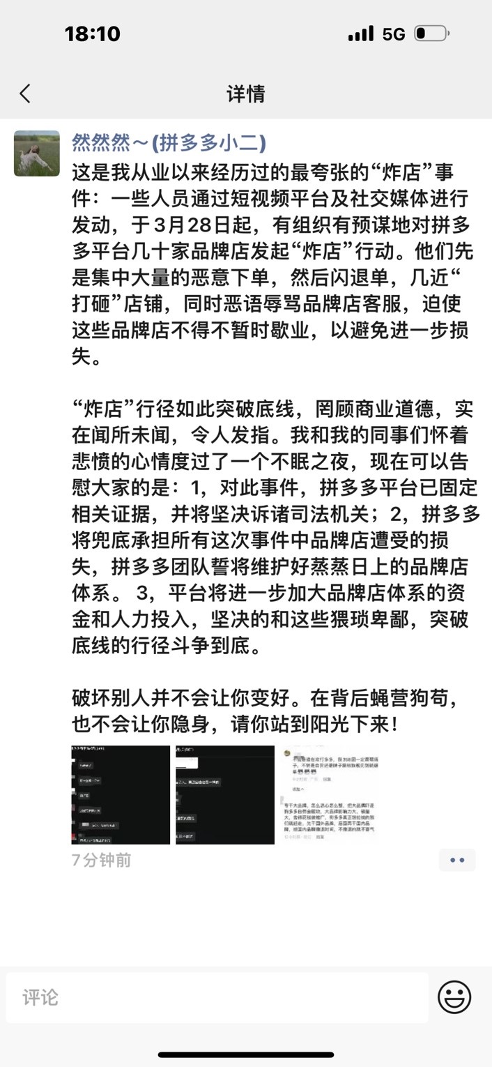 3月29日,針對(duì)近期拼多多平臺(tái)數(shù)十家品牌店遭遇有組織的“炸店”事件,有拼多多小二發(fā)布朋友圈稱,這是從業(yè)以來經(jīng)歷過的最夸張的惡意打砸店鋪事件,平臺(tái)已固定相關(guān)證據(jù),并將堅(jiān)決訴諸司法機(jī)關(guān)。