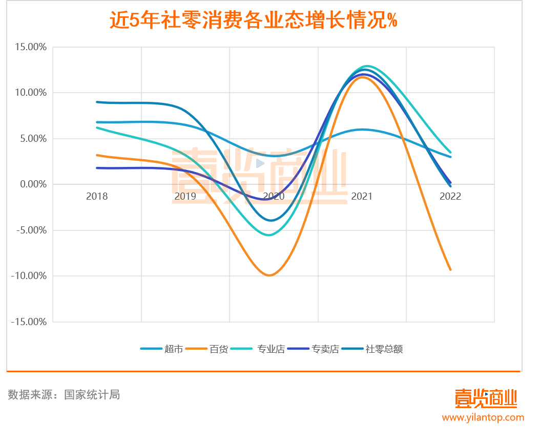 此外,統(tǒng)計(jì)國家統(tǒng)計(jì)局顯示,2018年-2022年間,百貨零售額增長率(橙色線)一直低于社零消費(fèi)總額增長率;超市屬于較為穩(wěn)健的業(yè)態(tài),但去年增長率略微提振后又出現(xiàn)回落。事實(shí)上,由于經(jīng)營模式落后,成本持續(xù)上漲,新興業(yè)態(tài)涌現(xiàn)、網(wǎng)絡(luò)購物,再加上疫情沖擊等多因素的影響,不少零售企業(yè)在近些年一直出現(xiàn)效益下降、關(guān)店止損的情況。