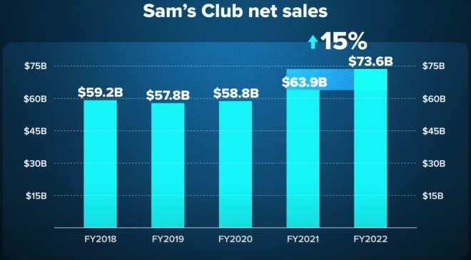2018財(cái)年至2022財(cái)年,山姆凈銷售額(單位:十億美元)。圖源:CNBC