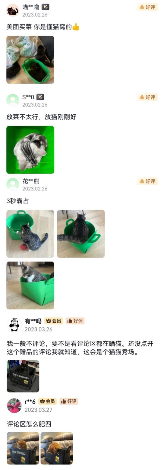 ▲數(shù)百位用戶在收納筐評論區(qū)曬貓(圖源:美團(tuán)買菜用戶上傳)