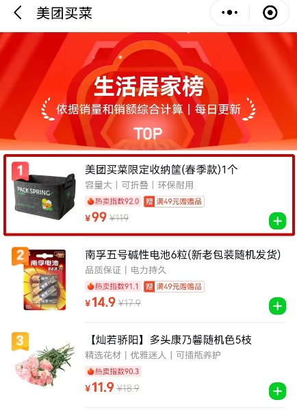 ▲收納筐成美團(tuán)買菜“生活居家榜”首位,超過電池、鮮花(圖源:美團(tuán)買菜頁面截圖)