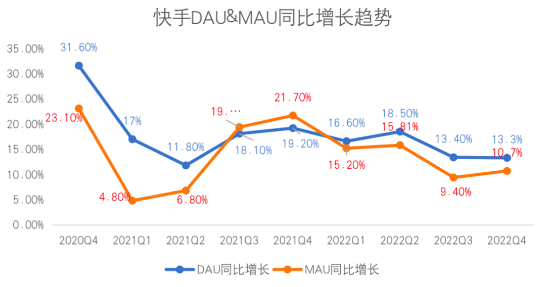 2022Q4,快手流量繼續(xù)擴(kuò)張,DAU和MAU分別為6.4億和3.66億,同比增長13.3%和10.7%,好于2022Q3,但是,環(huán)比增長僅0.8%和2.2%,流量增長天花板趨近。