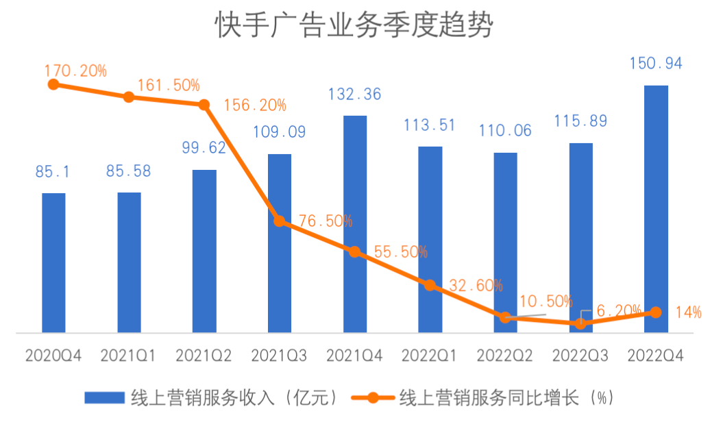營收占比53.4%的線上營銷服務(wù),依然是快手核心業(yè)務(wù)和最大收入來源,2022Q4同比增長14%,創(chuàng)下近三個(gè)季度以來的增速新高,超越彭博市場一致預(yù)期的9.5%?焓謴V告業(yè)務(wù)同比增長14%,業(yè)內(nèi)來看,低于騰訊Q4的15%,而騰訊是開啟視頻號(hào)商業(yè)化才取得這樣的增長。