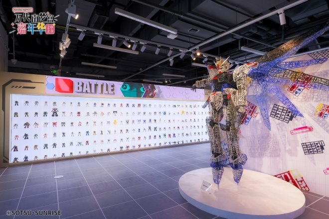 一整面的高達(dá)模型展示墻和流道自由高達(dá)立像,讓觀眾瞬間來到了高達(dá)的世界。在這里陳列了琳瑯滿目的高達(dá)商品,觀眾還可在此區(qū)域預(yù)約《高達(dá)聯(lián)合行動(dòng)》手游并獲得限量紀(jì)念徽章。