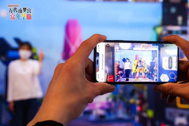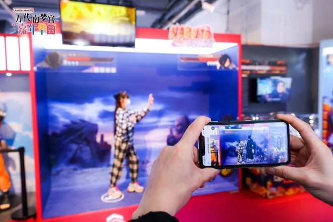 繼續(xù)前行,觀眾便進(jìn)入了各大知名IP的世界。在這里,除了觀看商品展示,來場者還可體驗(yàn)《航海王:燃燒意志》、《數(shù)碼寶貝:新世紀(jì)》,《火影忍者》手游AR,與游戲角色合影留念。