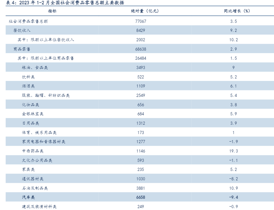 從宏觀因素來看,雖然今年春節(jié)期間,以餐飲、旅游、電影為代表的消費(fèi)市場雖迎來一波“報(bào)復(fù)性消費(fèi)”。但本質(zhì)上來看,這波“報(bào)復(fù)性消費(fèi)”更多是以春節(jié)和疫情全面放開后集中釋放的產(chǎn)物為主。在以汽車為代表的大品類消費(fèi)上,其復(fù)蘇程度遠(yuǎn)低于市場預(yù)期。比如說,據(jù)乘聯(lián)會(huì)數(shù)據(jù),2023 年1-2月廣義乘用車零售銷量為 2719 萬輛,同比下降20.2%。