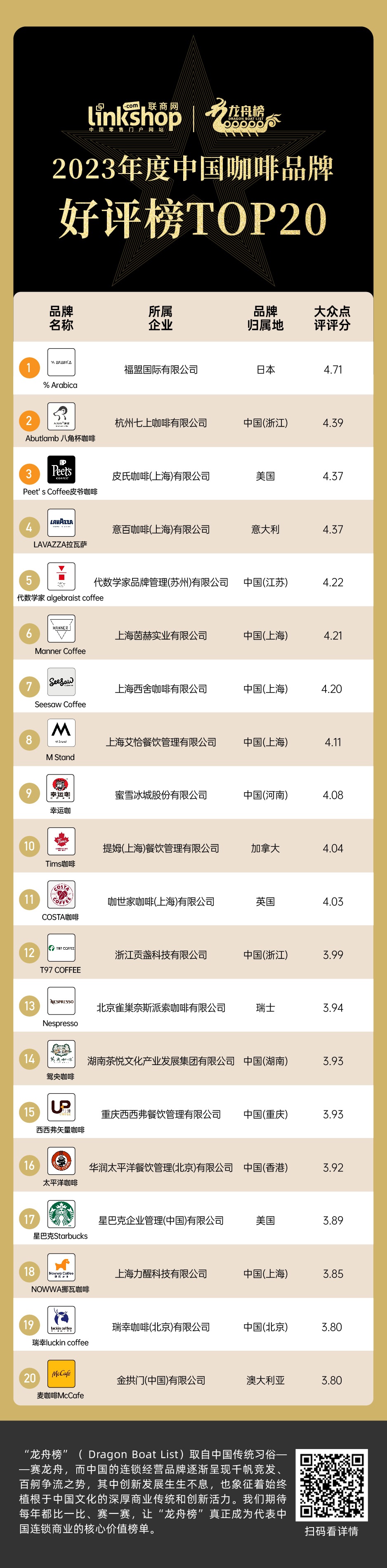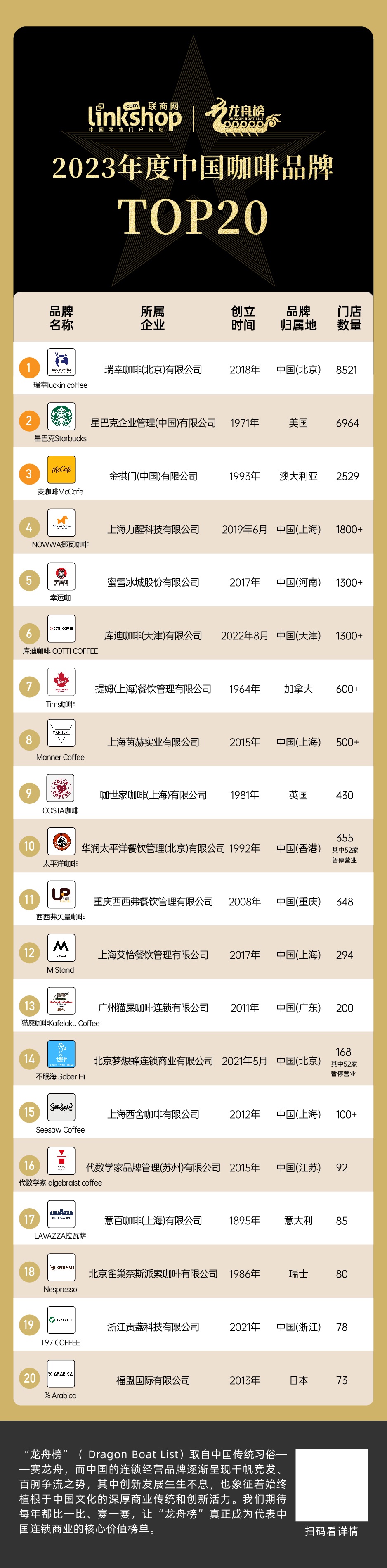 本期,《聯(lián)商網(wǎng)》評(píng)選出龍舟榜之“2023年度中國(guó)咖啡連鎖品牌TOP20”,以門(mén)店數(shù)量為標(biāo)準(zhǔn),輔以消費(fèi)者好評(píng)度、融資情況,以及新銳咖啡品牌,同時(shí)結(jié)合了多位行業(yè)人士的看法,以此探索咖啡賽道的發(fā)展趨向。