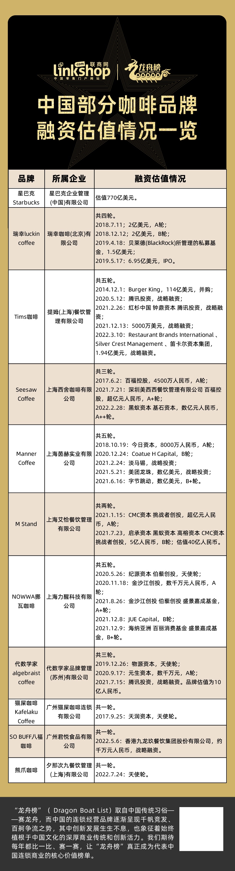 2022年,咖啡行業(yè)依舊是資本“寵兒”!堵(lián)商網(wǎng)》統(tǒng)計(jì)了部分咖啡品牌的融資估值情況。