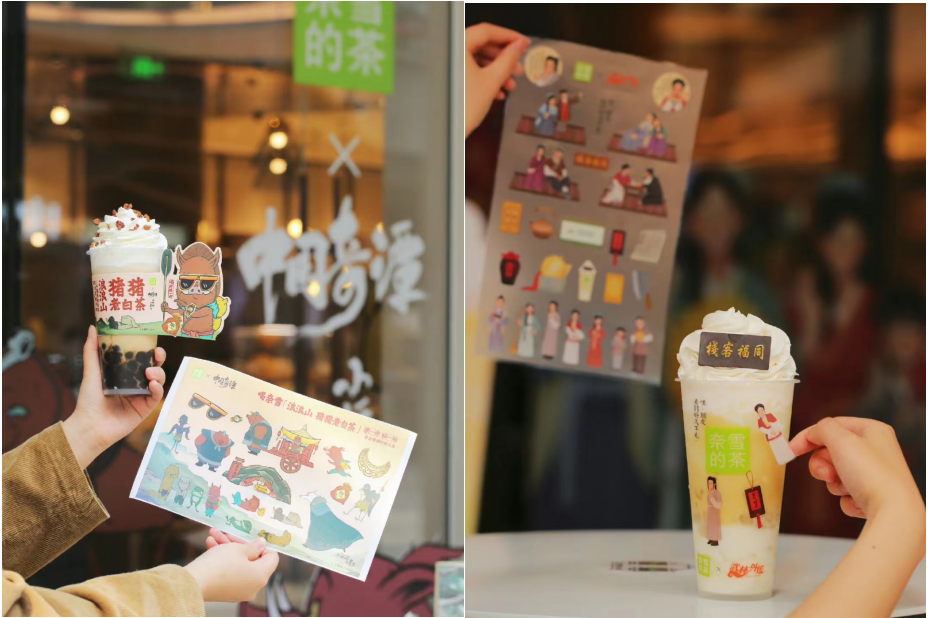 再看IP聯(lián)名。2023年前個三月,奈雪的茶就連續(xù)與多個知名影視IP合作,推出多個爆款產(chǎn)品,比如與《中國奇譚》動漫聯(lián)名,以“小豬妖的春天,翻過浪浪山”為主題,推出“豬豬老白茶”“雪頂豬豬老白茶”。