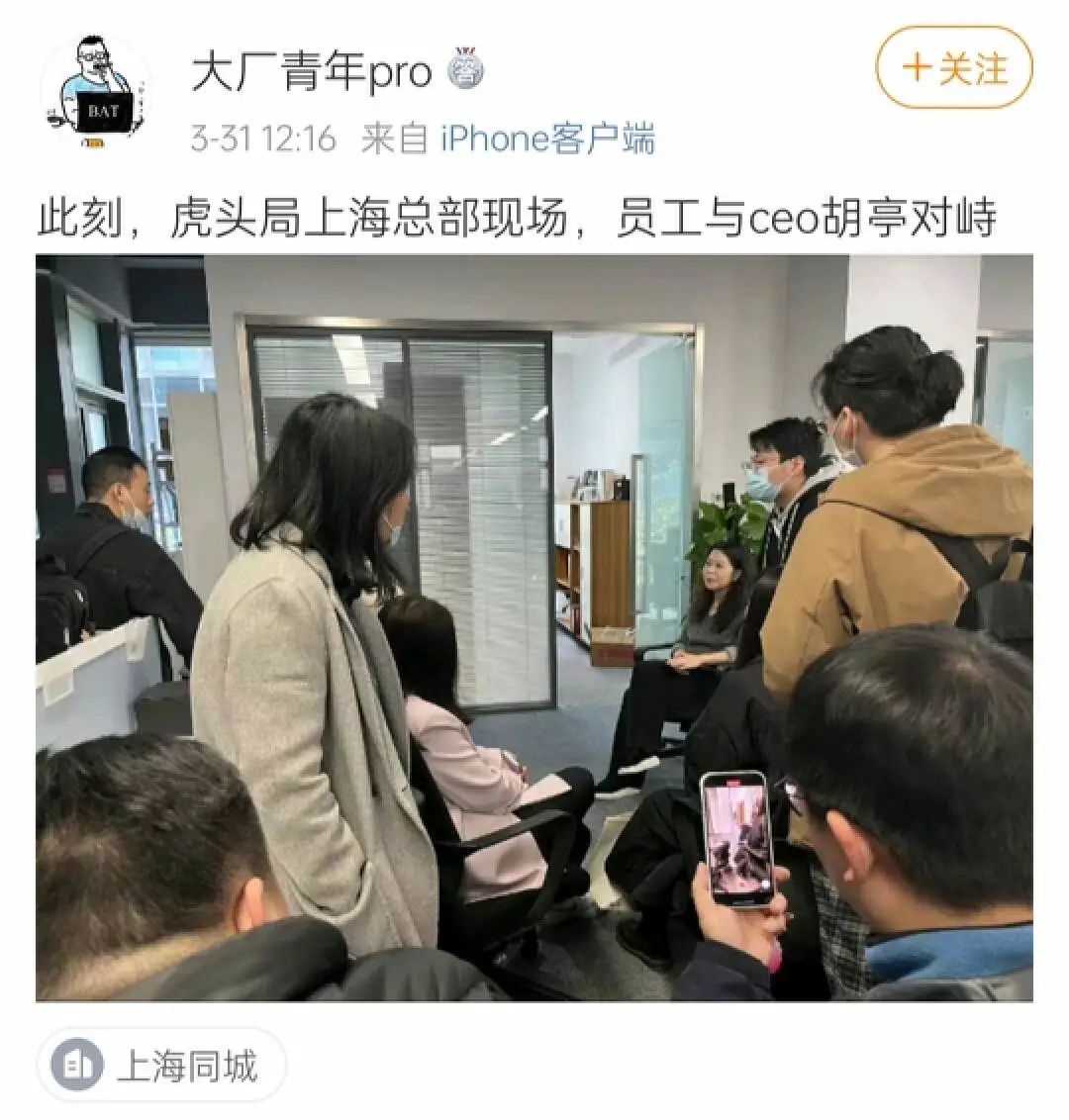 次日中午,疑似“第一波行動”的圖片流出,依然來自微博網(wǎng)友@大廠青年pro,“此刻,虎頭局上海總部現(xiàn)場,員工與CEO胡亭對峙”。人群中,有人正拿手機錄像存案。