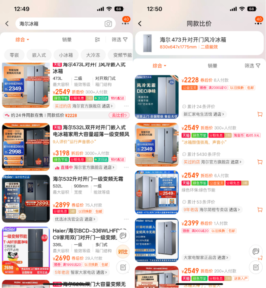 比如,在淘寶上搜索“海爾冰箱”,結(jié)果頁顯示,海爾473L對(duì)開門冰箱在全淘寶共有24款商品在售,最低價(jià)格為2228元。點(diǎn)擊“去比價(jià)”,同款商品的信息全部展示在頁面中,一目了然。