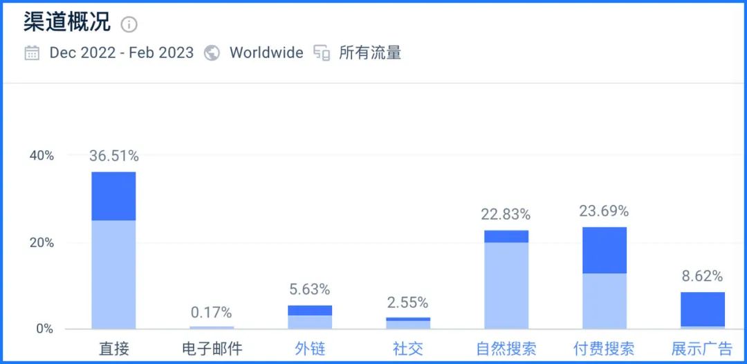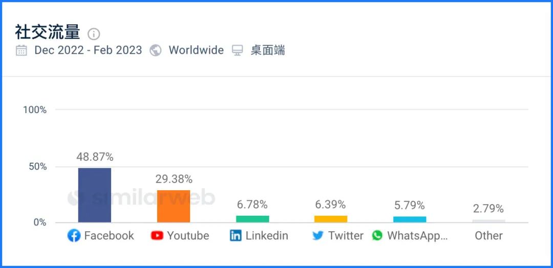 目前Miravia(電腦和移動端網(wǎng)頁)的主要流量來源是直接訪問(36.51%)、自然搜索(22.83%),以及付費(fèi)搜索(23.69%)三種渠道,社交流量則主要來自于Facebook(48.87%)和Yotube(29.38%)。