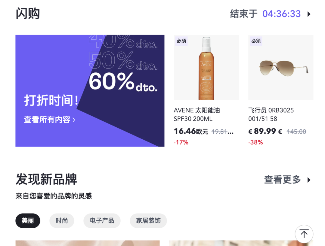 此外,“閃購”頻道被放在Miravia首頁上方最醒目的位置上。在這個(gè)專屬頁面下,展示參與折扣的所有商品,折扣力度最高達(dá)60%左右。